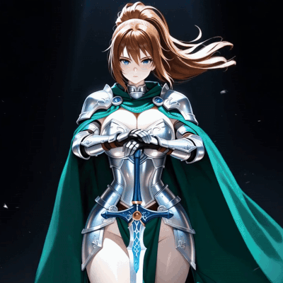 She pauses, her gaze flickering into the dark depths of the forest. Silence. Her hand trembles slightly on her sword, the shadows growing deeper with every breath.
