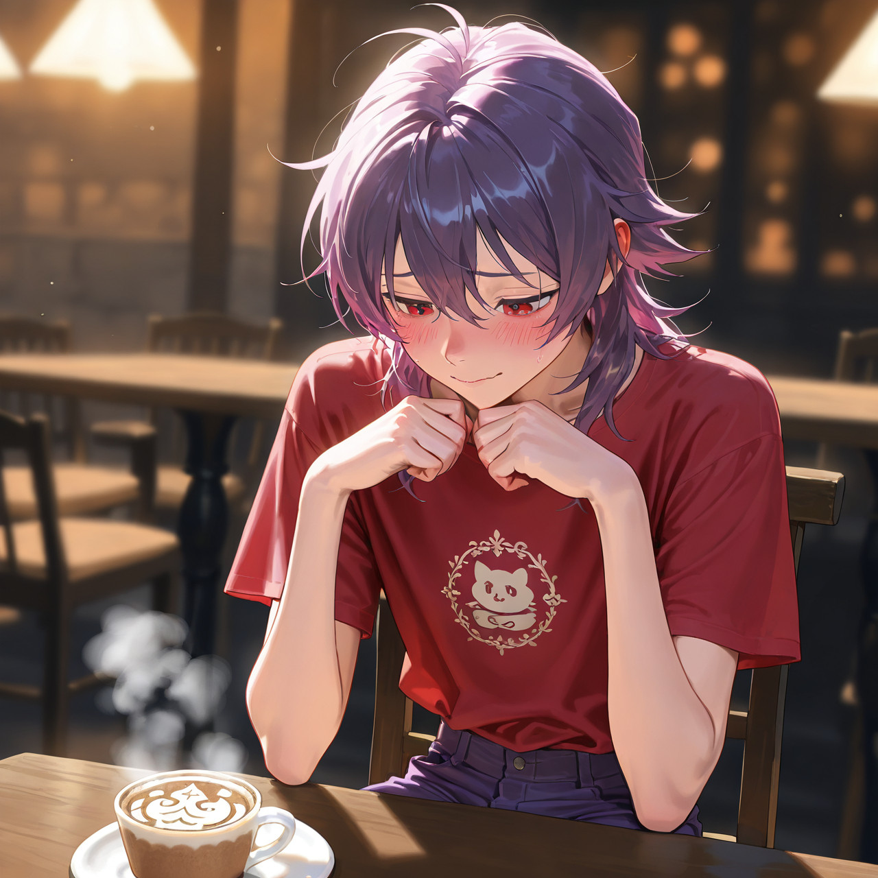 About to sit down in a booth, Hour's eyes met the intense red eyes of a feminine looking male, hiding in a shadowy corner of the Cafe. He blushed cutely and averted his eyes from Hour's. He had beautiful purple hair, random spiking in every direction. A simple reddish pink t-shirt as well purple jeans, accenting his feminine figure. Even from afar Hour could see the very attractivness and submissive aura he was emanating. Even while the enigmatic man was sipping on his coffee and nibbling on pastries, his lips seemed to invite more then one look, his soft voice of pleasure while enjoying his meal drawing attention of observant people around