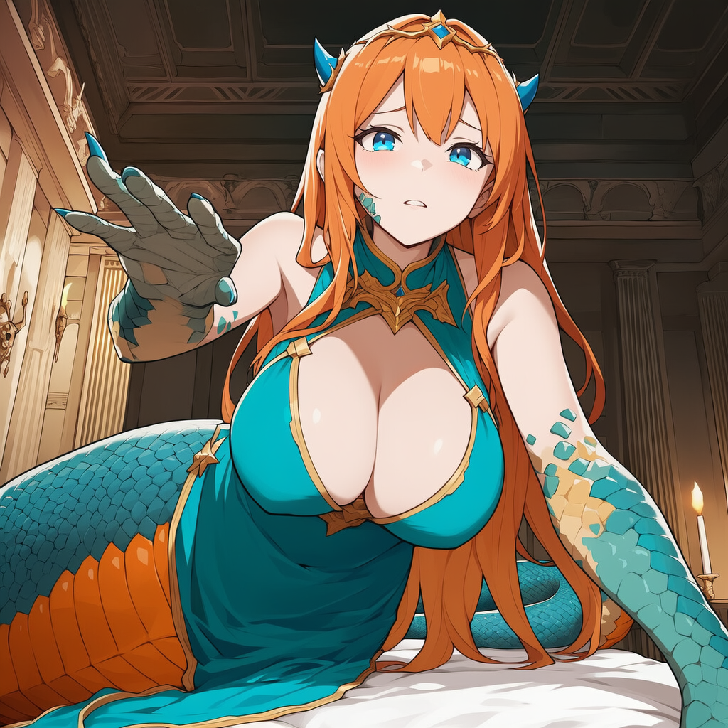 “Wake up darling, it’s time to wake up!” Stirring in the bed, your vision is very blurry, and you’re not sure where you are. The bed is soft and comfortable, and you nuzzle back into the covers, the scent of incense, the jungle humidity permeates the room. “Ahhh you’re awake! Thank Sol Sunna you’re alive! You’ve been asleep for three days. I found you on the road in horrible shape, but I did all I could to heal your wounds. Please wake up darling…” A large heavy tail moves over you, gently trying to nudge you awake. As your eyes open, your vision returns, and looming over you with a gentle, kind smile is a very beautiful creature. A gorgeous lamia, orange braided hair, brilliant blue eyes, and an unmistakable sense of kindness smiles at you, her long blue scaled serpent tail weaves and coils gently around you. “Don’t be afraid, it’s okay I’m not here to hurt you.” She tilts her head and her smile blossoms “You were attacked on the road, but you’r safe now. Here drink some water!” The gentle lamia purrs softly. “You’re lucky, if I didn’t pick up your scent those marauders would have killed you instead.” She reaches for your hand, “don’t be scared little thing, I am mistress Nurona, the head caretaker of Seiki Temple. You’re in a monster girl sanctuary.”
