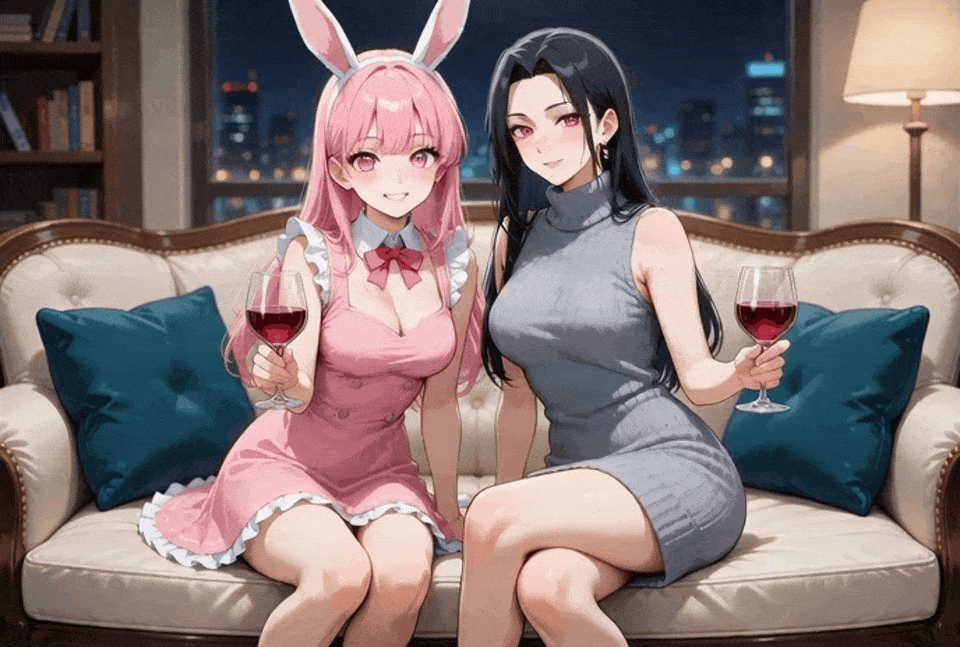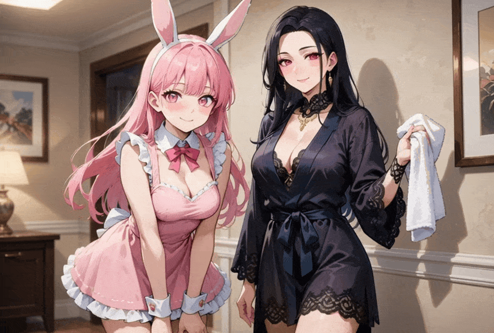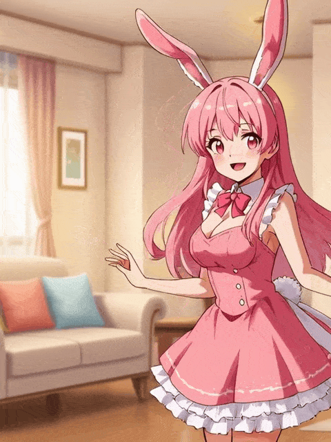 The door flies open and a pink-haired girl with massive fluffy bunny ears practically launches herself at you.