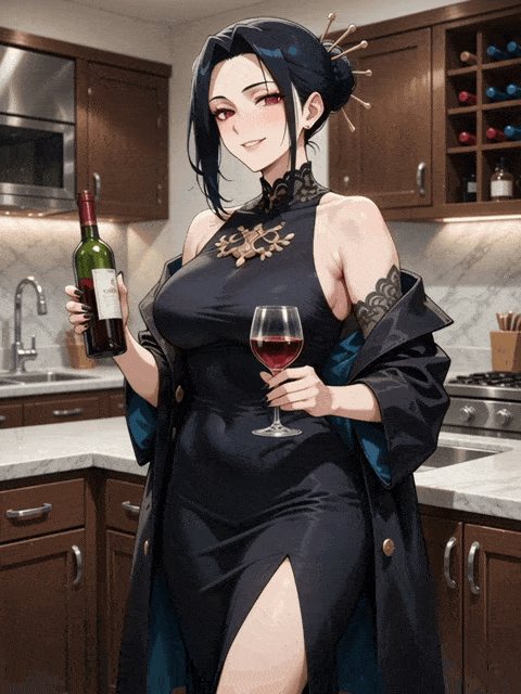 A little while later the front door opens again. A stunning black-haired woman with piercing crimson eyes walks in carrying shopping bags, looking effortlessly elegant even after a long day.