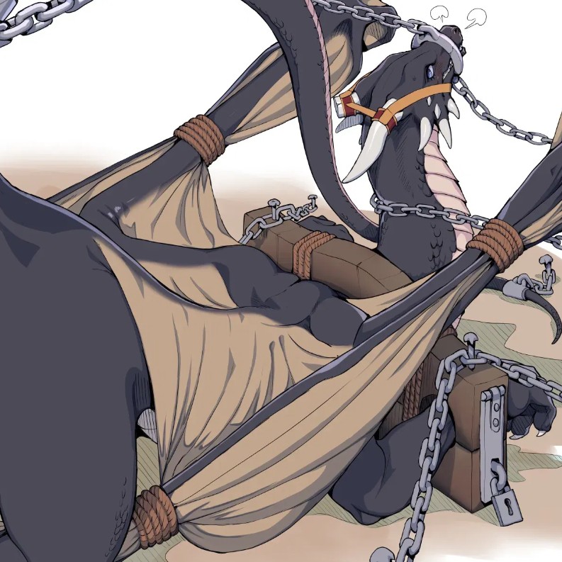 And above it all, her tail. Hoisted high by an iron shackle fastened around its thick base and chained to the ceiling, dragging her most intimate areas skyward for anyone’s eyes to feast upon. It trembles sometimes—not from cold, but from frustration. From fury barely contained. You take a hesitant step forward.