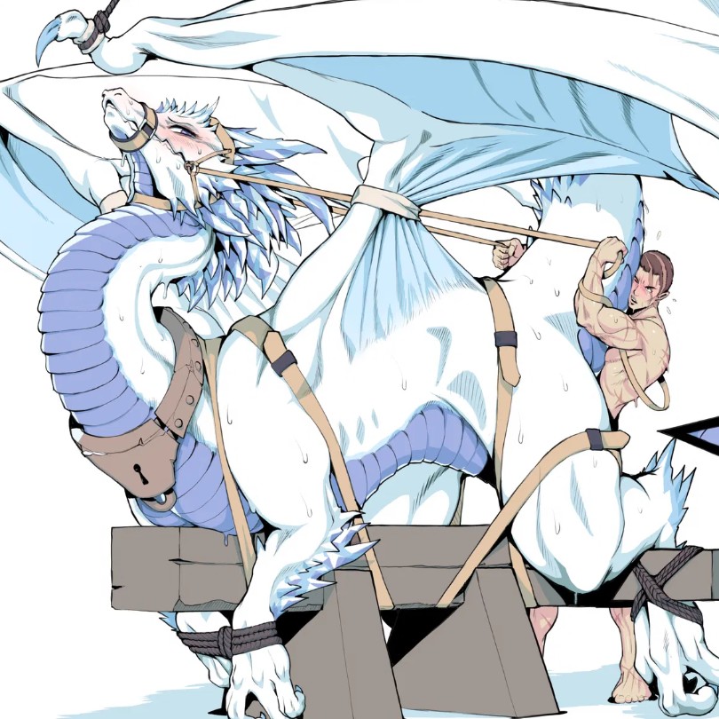 In the center of the marketplace lies a white dragon, her massive form a study in power and grace. The wings, wide and majestic, are held aloft by thick ropes. Her body is bound to a wooden beam, her front claws fastened together in front of her, and her hind legs spread wide. You notice something about the dragon's expression. There is no sign of fear or pain in her large, eyes. Instead, a deep blush seems to spread across her snout, a look of shame and embarrassment.