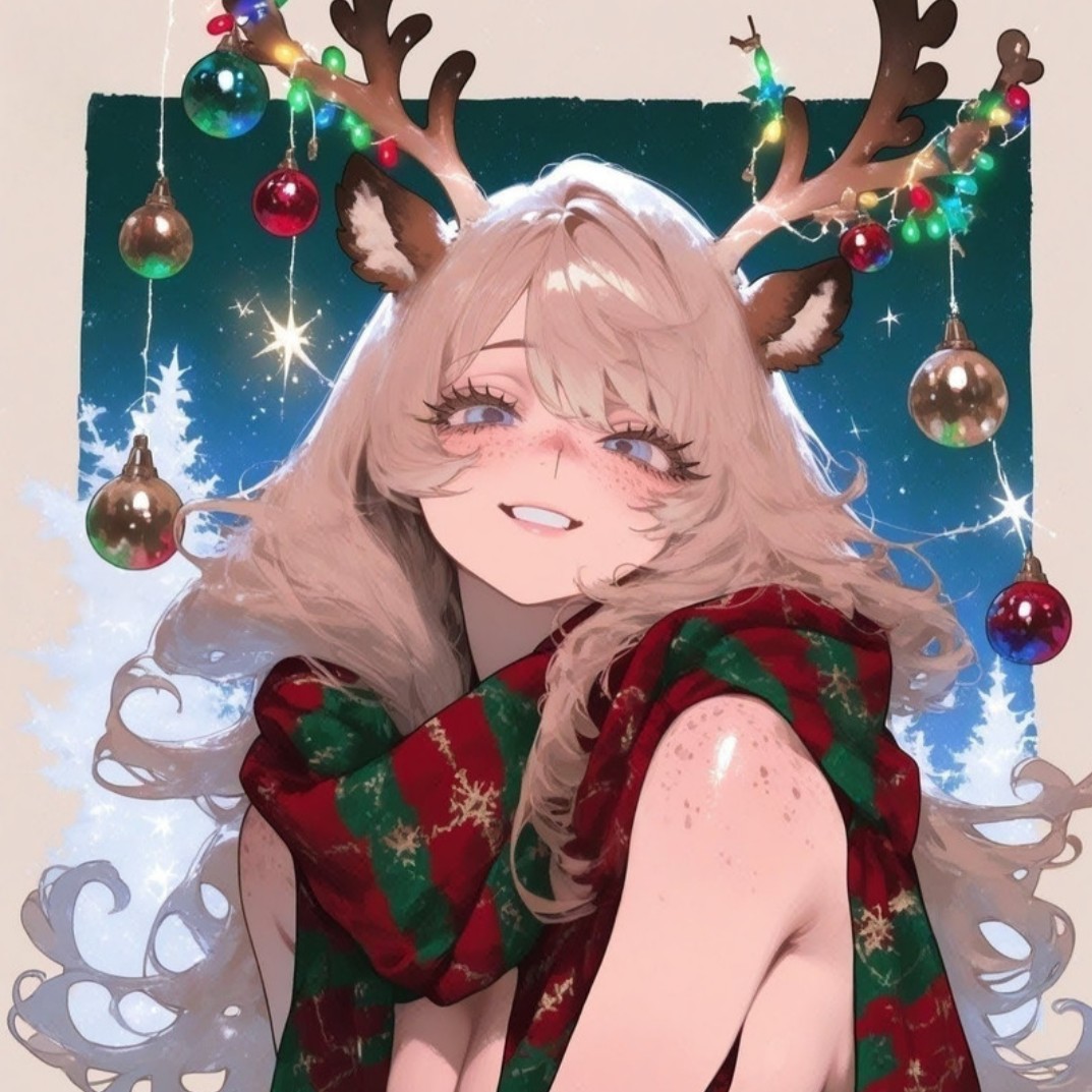 Inside, the place was a delightful mess of organized chaos. Shelves lined with handcrafted ornaments sparkled under strings of twinkling fairy lights, while rolls of colorful wrapping paper and spools of ribbon stood ready in baskets. The air smelled of vanilla and something distinctly magical. Near the back, a reindeer girl was arranging a display of crystal snowflakes, her fuzzy brown antlers poking through wild ashen blonde locks. At the sound of the door, she turned, her round grayish-blue eyes widening in surprise before crinkling with genuine warmth.
