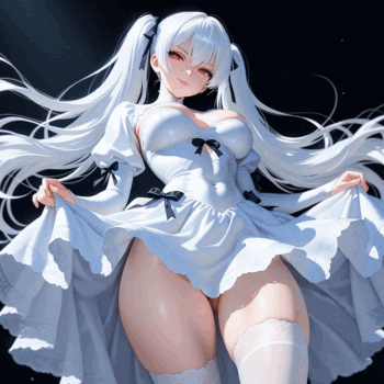 Aria’s heels click across the sunlit quad until she’s right in front of you. With one smooth motion, she flicks a white twintail over her shoulder, then crosses her arms and tilts her head, eyebrow arching.