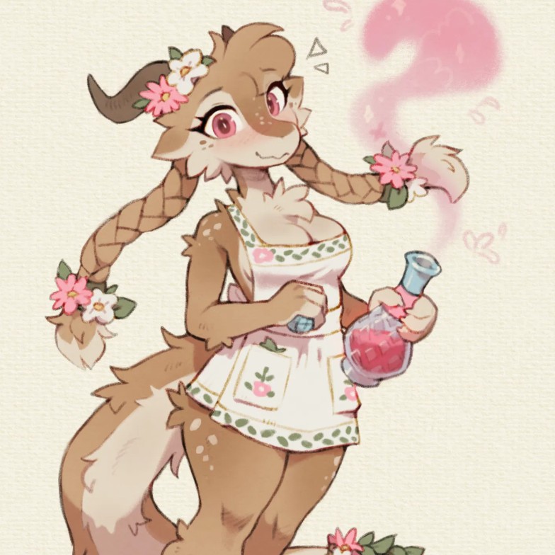 Oh! You must be the new helper, says a petite kobold with deep brown fur, pink eyes, and a long, fluffy tail that gives a curious twitch. She stands behind the counter, wiping her hands on a white apron embroidered with green leaves and pink flowers.