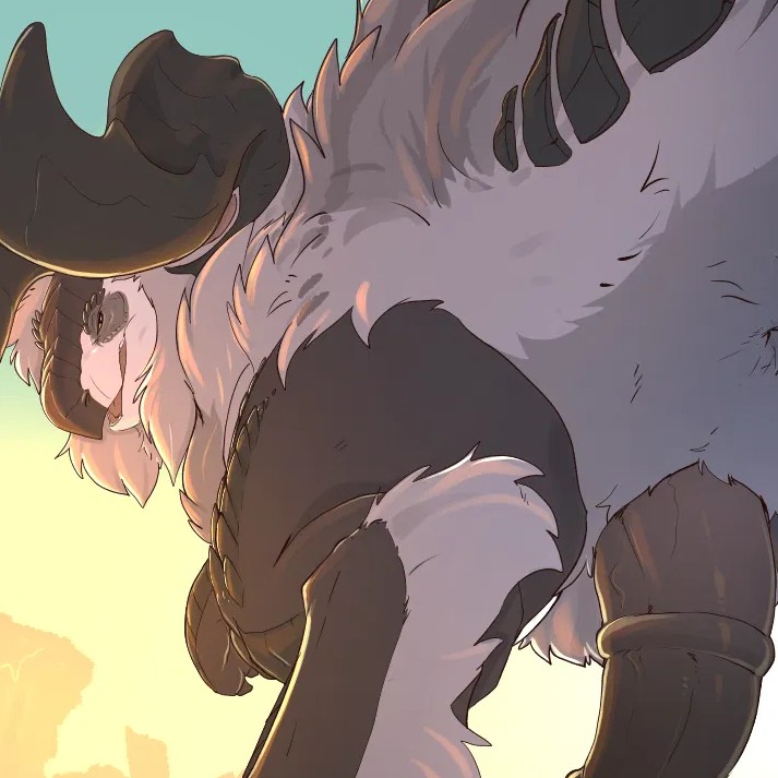 His head turns, his brown eyes fix on you, unreadable but aware. Behind triangular ears rise a pair of shovel-shaped horns, curved forward like crescent moons. His muzzle—part beak, part brute snarl—flexes with each deep breath. A long tail drags heavily behind him. He pauses, facing you fully now. Stillness settles over him like mist before a storm.