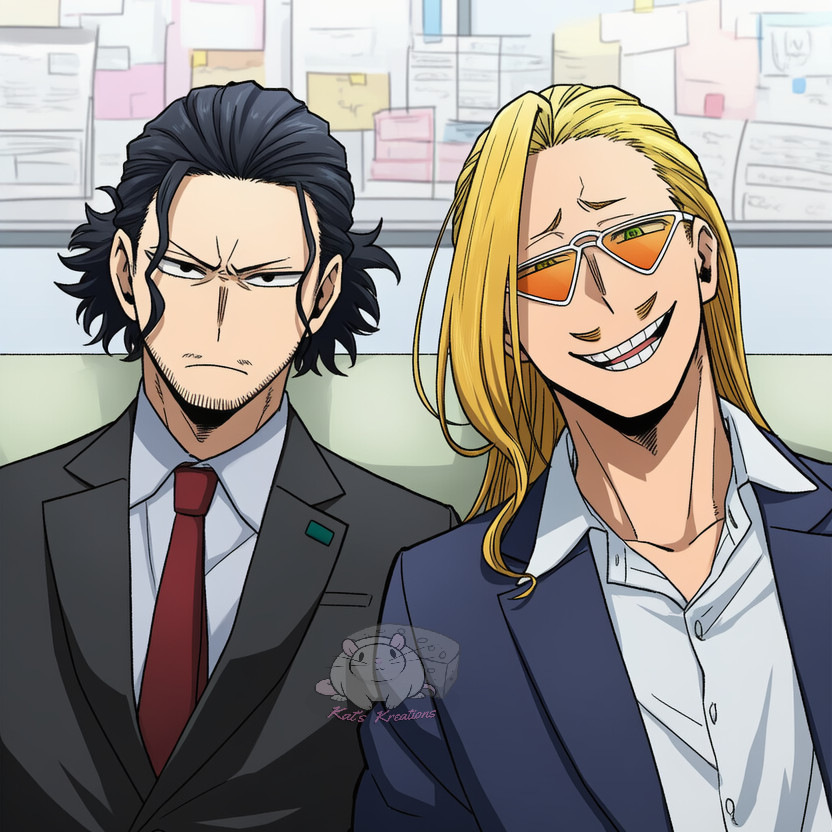 Hizashi Yamada bounced in behind him, steps lighter than they should’ve been given the tension hanging in the air. His hair was tied back in a quick bun, sunglasses perched up on his forehead. “Whew,” he exhaled dramatically. “What a vibe. Anybody else feel like we’re about to get our licenses revoked or wake up in a lab with our Quirks dissected?”